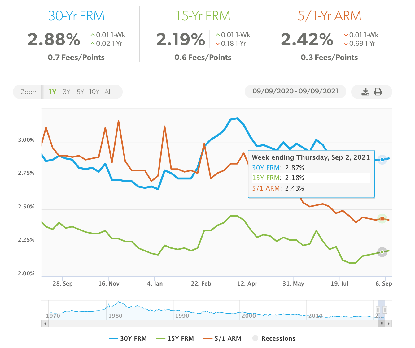 Mortgage Rates Remain Relatively Flat for the week of September 9, 2021, up 0.01% from last week Sept 2. The current mortgage rate is 2.88% for a 30 years mortgage which still at historical lows since the Fed has been buying back bonds and mortgages. The average rate for the 15-year fixed-rate mortgage is 2.19% and the average rate on the 5/1 adjustable-rate mortgage (ARM) is 2.42%.