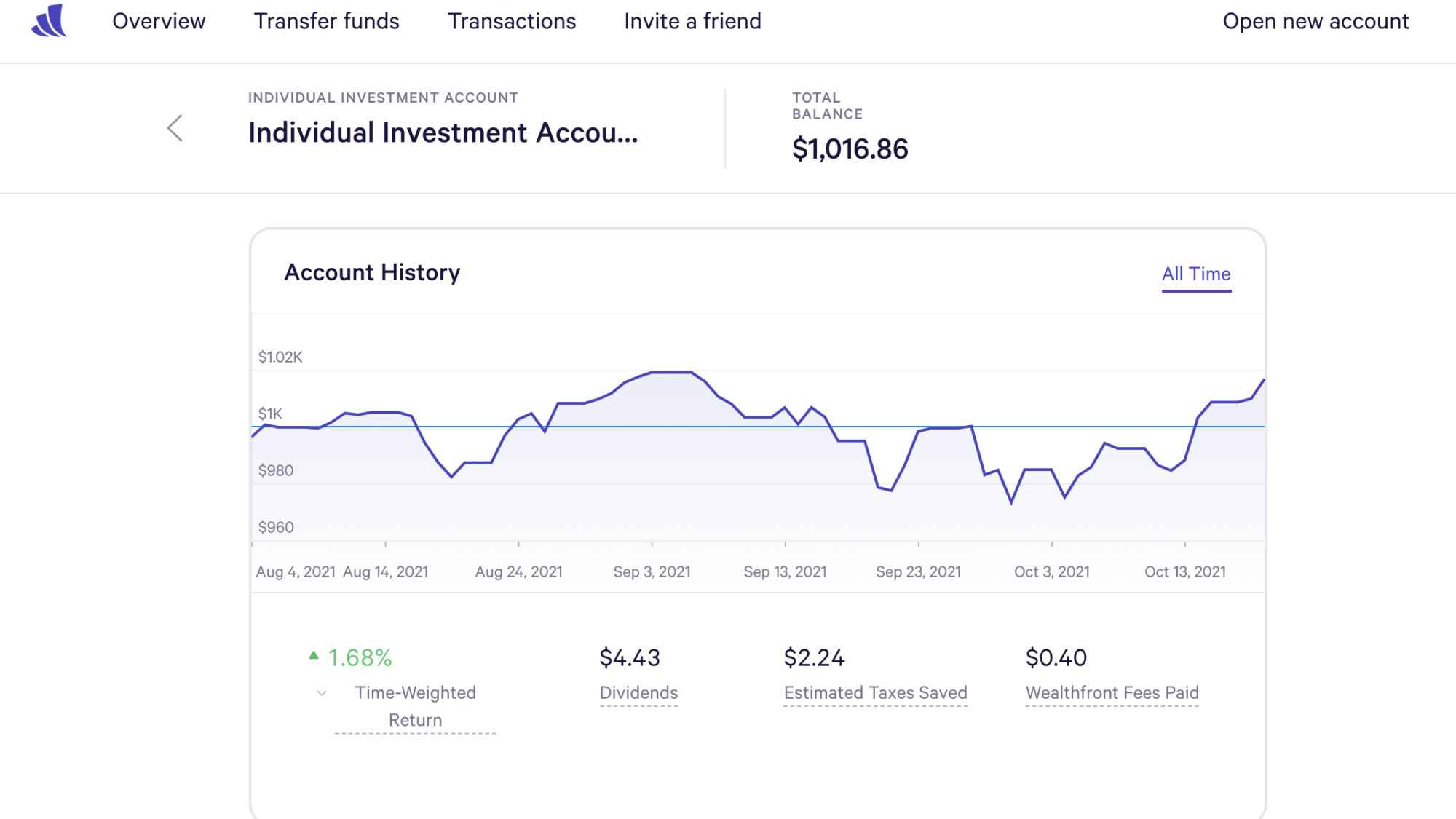 How this affects our $1000 investment in Wealthfront – our Wealthfront stocks continue to have positive gain following the stock market. This puts our investment above the initial investment of $1000, currently at $1016.86.