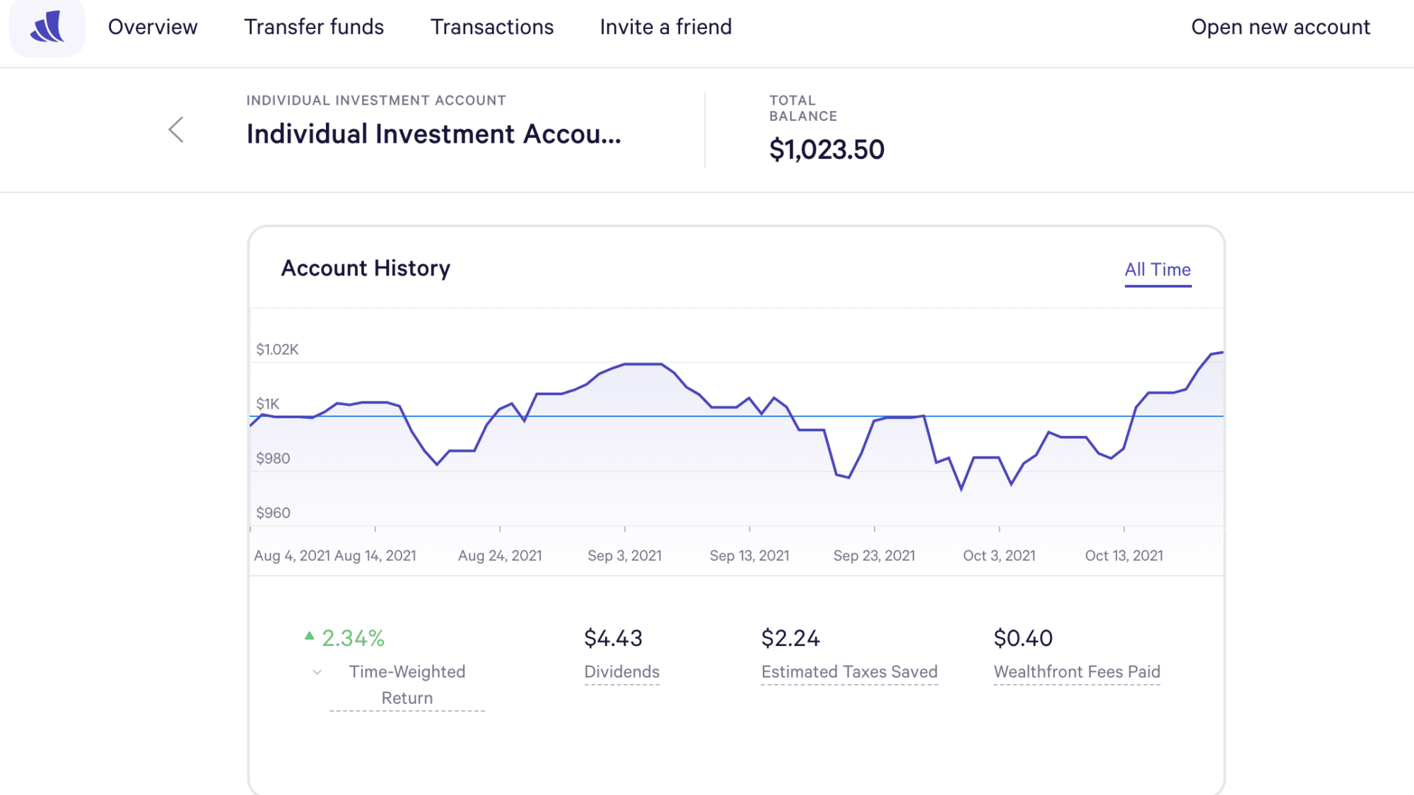 How this affects our $1000 investment in Wealthfront – our Wealthfront stocks had a small gain. This puts our investment above the initial investment of $1000, currently at $1023.50.