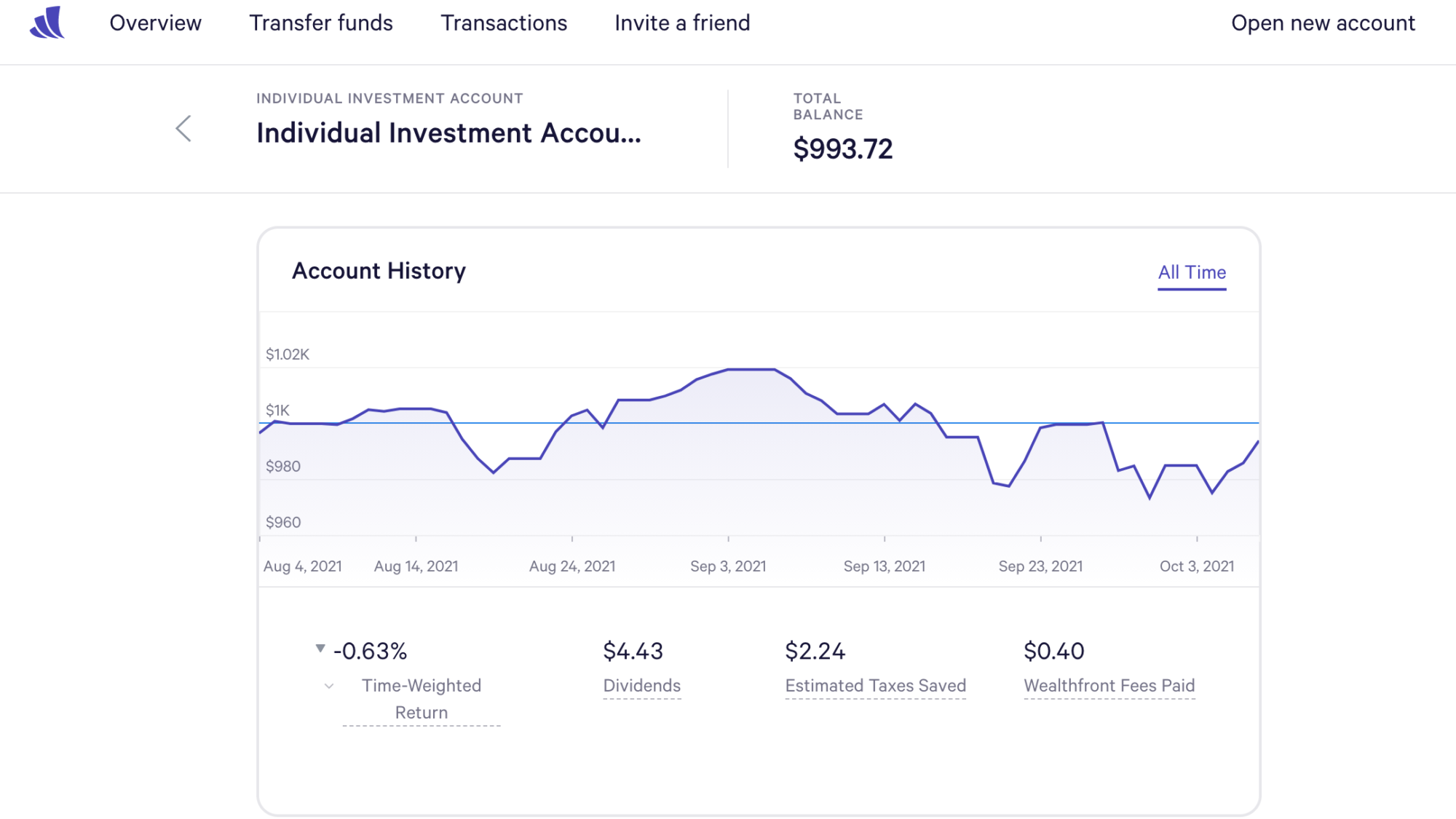 How this affects our $1000 investment in Wealthfront – our Wealthfront stocks are starting to recover, but still below our initial investment of 1000, currently at $993.72. Although it improved a few dollars from yesterday, it’s still down from the bad month in September.